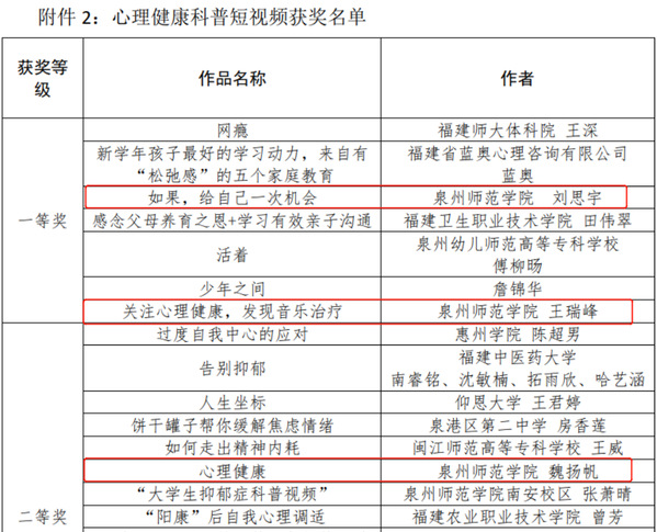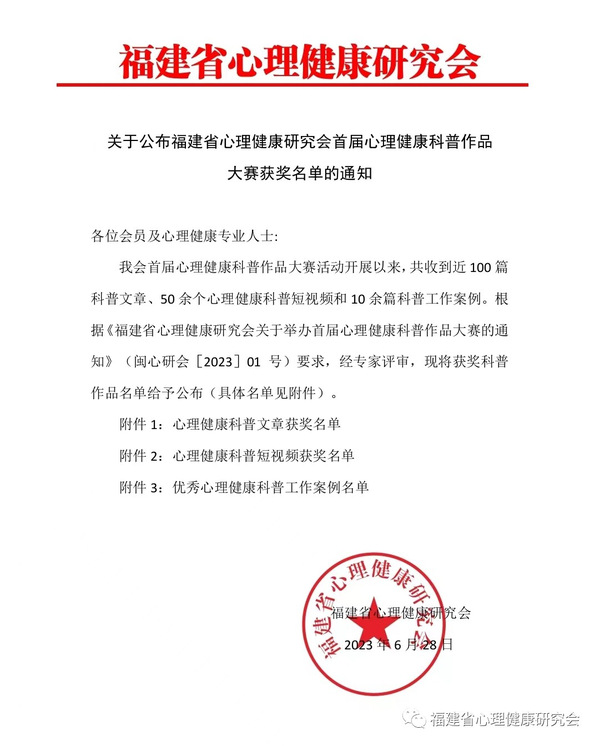 6月28日,福建省心理健康研究会首届心理健康科普作品大赛获奖名单公布。教育科学学院学子总计获奖五项。其中,在心理健康科普文章项目中,教育科学学院研究生郭腾云《女性恐婚原因之一——“妈宝男”》获得二等奖,应用心理学本科生汪玉《我允许我有力量》获得优秀奖;在心理健康科普短视频项目中,教育科学学院研究生刘思宇《如果,给自己一次机会》、王瑞锋《关注心理健康,发现音乐治疗》获得一等奖,魏扬帆《心理健康》获得二等奖。