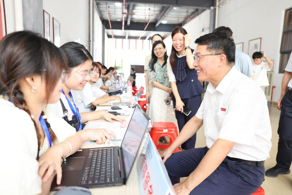(校党委书记柯瑞清了解报到流程并亲切关怀工作人员)