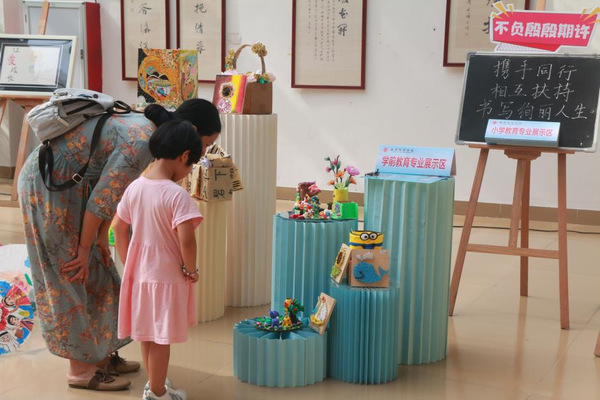 百样风采,花式迎新“心对心”。让爱同行,用油墨承载着心意送给他人,通过“心情交换盲盒”让鼓舞人心的话语在每一位新生之间不断传递。各专业“大展身手”:激扬青春,小学教育专业的硬软笔书法作品尽显师范生技能水平;学前教育专业以“简笔画”、“基础画作”等形式体现“寓教于乐”的专业理念;无人机、积木卡丁车等高科技展品是数字媒体专业的“未来畅想”;应用心理学专业准备心理沙盘让新生在动手体验中探索内心世界;特殊教育专业则提供运动组合装置、平衡台、平衡车等,带新生走进特殊教育的感觉综合训练。