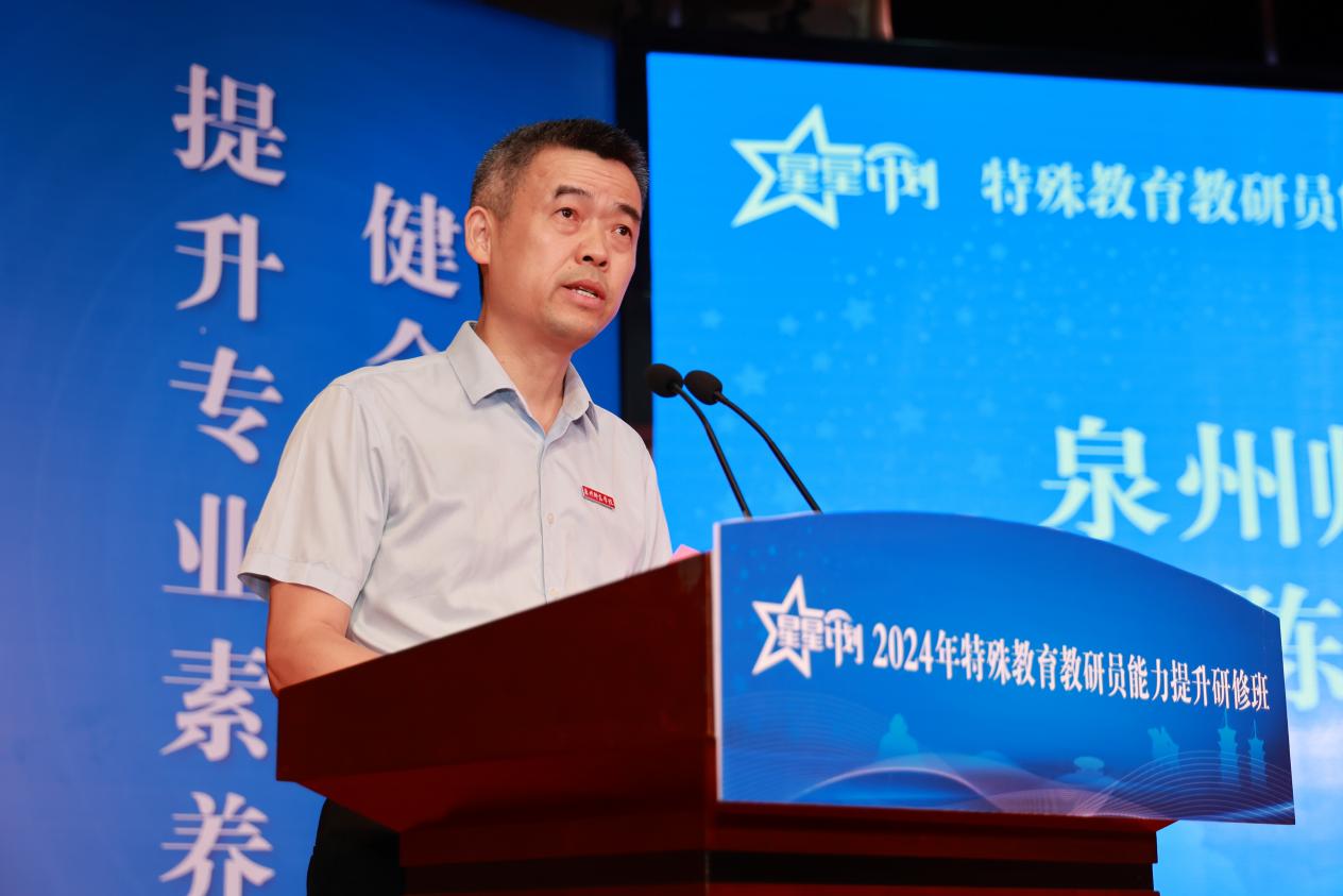 教育部基础教育司副司长李海胜对此次研修班的胜利举办表示热烈祝贺,对福建完善特殊教育保障机制、提高特殊教育质量等予以充分肯定,对我校特殊教育学科专业建设成绩表示赞赏。他在讲话中指出,此次特殊教育教研员能力提升研修班,是近年来首次举办的国家级特殊教育教研员队伍专项培训,这既是贯彻落实党的二十大关于“强化特殊教育普惠发展”的实际行动,也是落实党的二十届三中全会“健全特殊教育保障机制”的具体体现,对建设教育强国,提升民生保障力,构建公平优质基础教育体系具有重要意义。办好特殊教育,是党和政府坚持以人民为中心、弘扬人道主义精神和保障基本人权的重要举措,是推进教育高质量发展、加快建设教育强国的应有之义,也是推进中国式现代化、实现共同富裕的内在要求。他强调,加强特殊教育教研工作,是提升特殊教育质量的关键所在。各级教育部门要高度重视特殊教育教研工作,健全教研体制机制,加强教研队伍建设,提升教学研究水平和教学指导能力,为特殊教育高质量发展提供有力支撑。