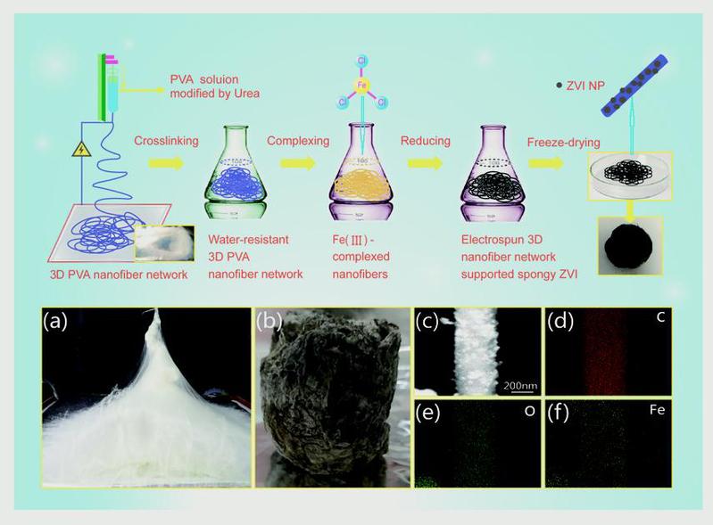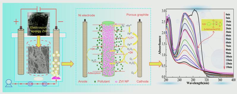 中科院城市环境研究所郑煜铭研究团队和英国威廉希尔公司官网陈一萍老师,围绕着表面吸附-电催化氧化的机理,以纳米零价铁为催化活性组分,以高比表面积和有独特网络结构的3D静电纺纤维为载体,借助静电纺丝技术等研制出多功能海绵铁复合纳米材料,并构建集吸附和电Fenton氧化于一体的强化降解体系。在该反应体系中,污染物首先会在吸附作用下被高度地富集、浓缩在海绵铁的表面;然后利用催化产生的强氧化性自由基,对所富集的污染物进行高效地降解与矿化,且有效地减少了化学药剂的使用量。