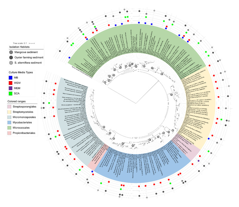 放线菌(Actinobacteria)是一类好氧,高G+C含量的革兰氏染色阳性细菌。因放线菌能产生丰富多样的次级活性代谢产物而备受关注,如抗生素、酶制剂等。近岸沉积物中蕴含着丰富的海洋微生物资源,是人类开发利用的宝贵财富。然而绝大多数的微生物仍然未培养(uncultivated),如何获取微生物资源是人们一直关注的重点问题。