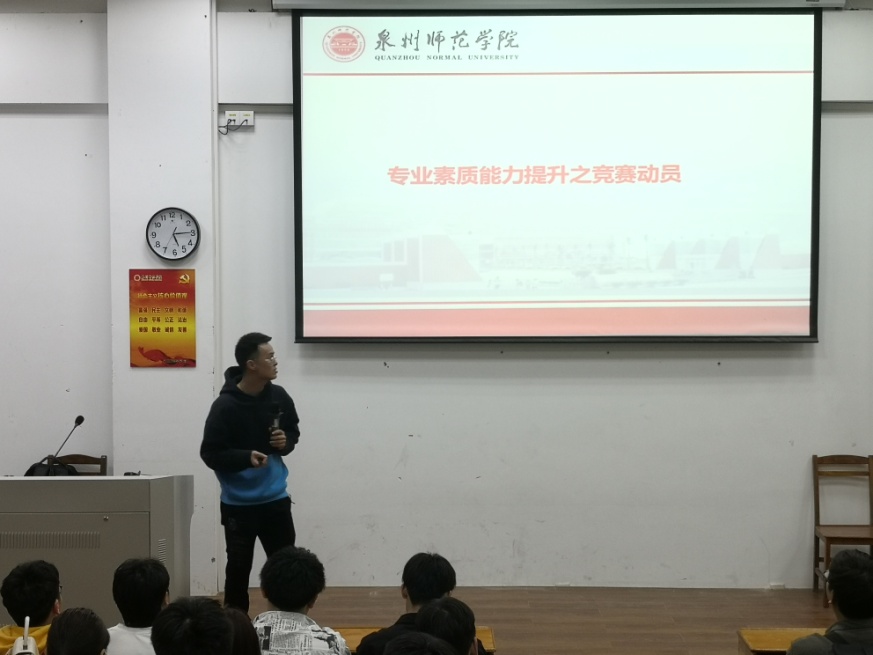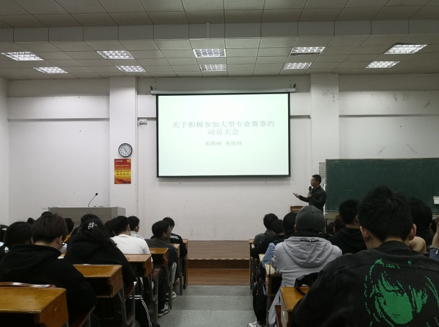 会议伊始,邓腾树老师以历届参赛情况及同学获奖情况为切入点,向大家介绍参加竞赛的益处和必要性。他指出,学生多参加大型专业赛事有助于激发专业学习热情、丰富课余生活、增长知识见识,对以后考研、考教、考公、就业笔试和面试等诸多方面大有裨益。他对同学们寄予了殷切期望,希望各位同学在学好自身专业课程的基础上积极参与各类学科竞赛,以赛代练,加强思想淬炼、专业训练、实践锻炼、不断为自己专业知识充电,丰富人生履历,学有所获、学有所成。