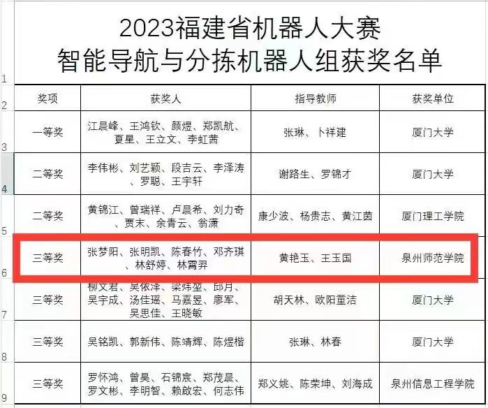 11月26日,由福建省教育厅主办、厦门大学承办的2023年福建省大学生机器人大赛在厦门大学翔安校区落下帷幕。交通与航海学院首次组队参赛并斩获智能导航与分拣机器人组三等奖〖指导老师:黄艳玉、王玉国,学生:张梦阳(轮机工程)、张明凯(计算机科学与技术)、陈春竹(轮机工程)、邓齐琪(轮机工程)、林舒婷(经济学)、林霄羿(轮机工程)〗,这也是我校首次进入福建省机器人大赛并唯一获奖的项目。
