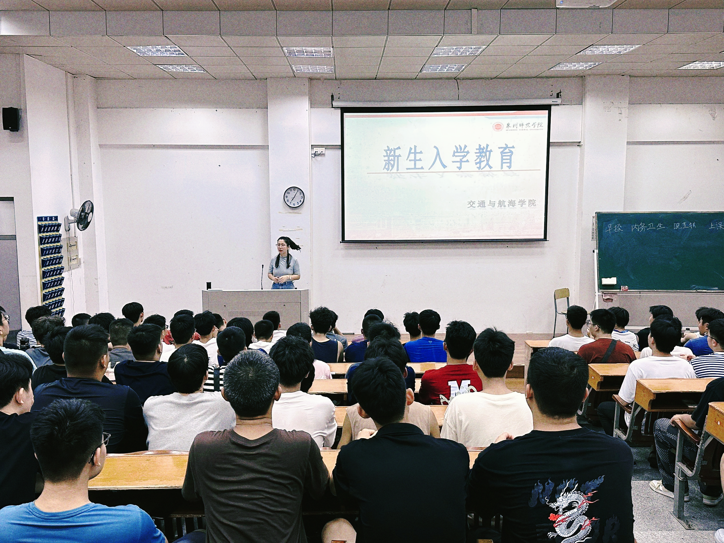 首先,郭凯琳对全体新生加入交通与航海学院大家庭表示欢迎,接下来对学校的学籍管理、考风考纪、“学生上课十要、十不要”等相关规定进行了详细的介绍,让新生们明确自己在校内的权利与义务,同时强调新生们应正确地行使自己的权利以及严格履行应尽的义务。最后,半军事化管理委员会副主席徐崇泽同学给全体新生介绍了学院的半军事化管理制度及相关要求。