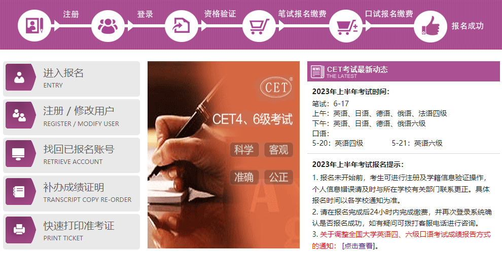 2023年6月全国大学英语四六级考试于6月17日进行,凡成功报考本次四六级考试者,可于6月8日登录全国大学英语四、六级考试报名网站打印准考证。详细打印流程如下: