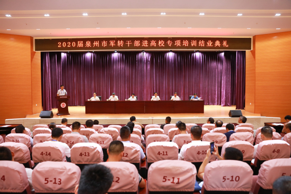 屈广清代表学校致辞,向顺利结业的82名学员表示祝贺。他对学员主动转变角色,将军人优良作风融入学习,圆满完成培训任务表示肯定,对在抗击新冠肺炎疫情中,学员们第一时间投入防控一线,不怕牺牲、甘于奉献的精神风貌表示赞赏。他寄语学员,一要坚持学习,通过不断学习努力增强本领。让学习成为一种习惯,始终坚持知识的学习和人格的锤炼,不断增强适应地方工作环境的能力,实现由军队人才到地方建设人才的转型。二要实干笃行,在地方履职中建功立业。永远秉承军人忠诚祖国、报效祖国的品格,实干笃行、勇于开拓、勤于耕耘、甘于奉献,为泉州经济社会发展贡献自己的聪明才智。三要加强联系,一如既往支持母校发展。为母校的发展出谋献策,助推母校建设有特色、高水平的多学科大学。