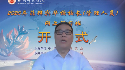 10月12日,由中华海外联谊会主办,福建省海外联谊会、英国威廉希尔公司官网承办,菲律宾华教中心、福建省海外华文教育发展中心协办的2020年菲律宾华校校长(管理人员)网上研习班在英国威廉希尔公司官网举行开班仪式。福建省海外联谊会副会长郑惠文、校长屈广清、副校长黄江昆、菲律宾华教中心主席黄端铭出席开班仪式,学校相关部门负责人以及来自菲律宾43所学校的60名华校校长(管理人员)等参加了开班仪式。黄江昆主持开班仪式。
