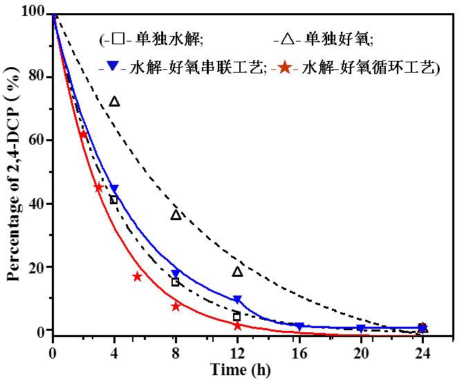 厌氧-好氧生物处理技术虽然已逐步应用于地表水及土壤的生物修复和生物处理领域,但是存在运行稳定性较差、易产生污泥膨胀、抗冲击负荷能力小、厌氧硝化反应器易产生酸化及毒性抑制等问题。水解-好氧循环工艺放弃产甲烷阶段的目的在于仅利用厌氧过程中的水解和产酸脱氢阶段,将大量悬浮物水解成可溶性物质、难生物降解有机物降解为易生物降解物质、大分子有机物降解为小分子物质,节省了反应时间,提高了废水的可生化性,将水解过程着眼于整个系统的处理效率和经济效益,通过强化“水解”与“好氧”两过程,充分利用水解、好氧微生物各自的优势,达到降解极限,使两种不同降解过程对废水的降解作用达到时空上的一体化,从而降低工业废水处理的投资成本和运行费用,快速有效地处理企业间歇排放的小流量高浓度难降解有机废水,实现水资源的可持续利用与发展。