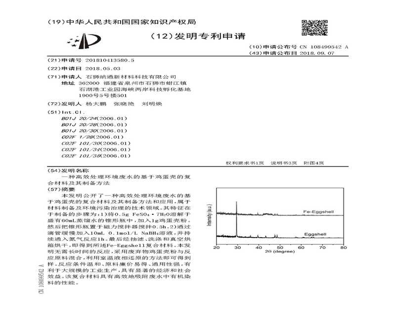 发明专利(专利号:201810413580.5),专利名称:一种高效处理环境废水的基于鸡蛋壳的复合材料及其制备方法。