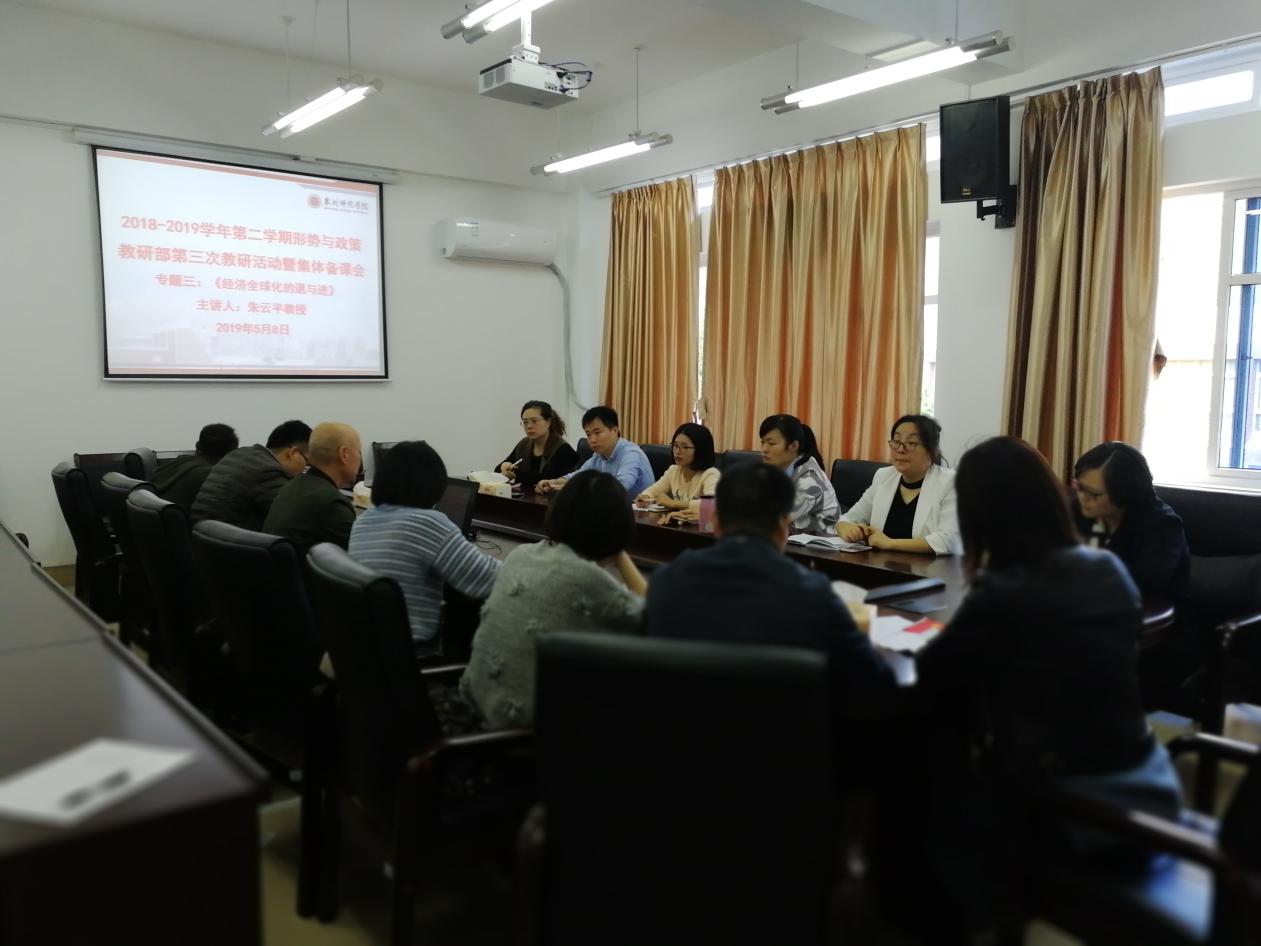 2019年5月8日,马克思主义学院形势与政策教研部举行2019年春季第三次教研活动暨“经济全球化的退与进”(专题3)集体备课会,邀请朱云平教授辅导现场指导。朱教授对教学过程中的重点把握、难点突破、案例选择、资料使用等几个方面进行辅导,对任课教师有效开展本专题教学启发很大。