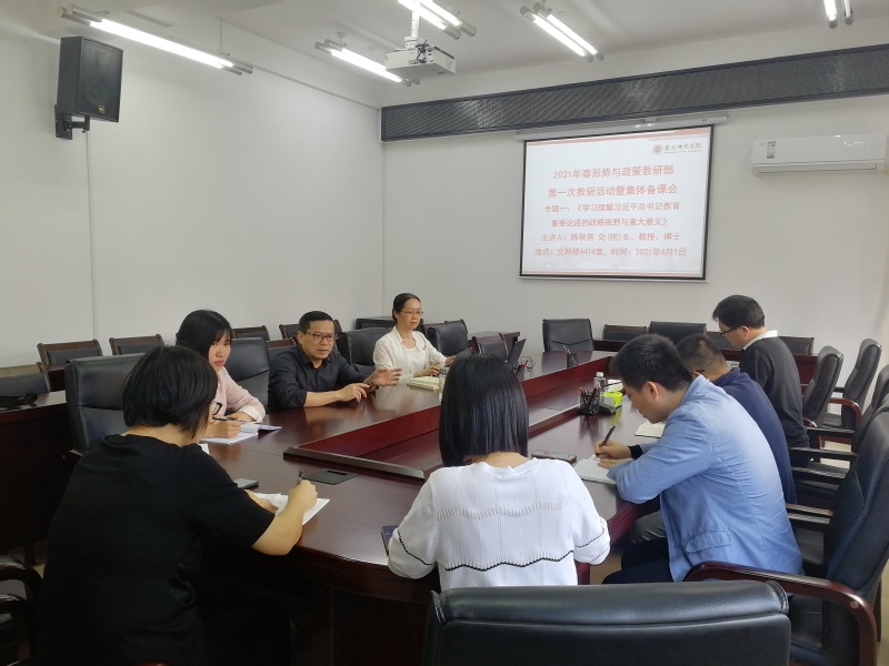 2021年4月1日,马克思主义学院形势与政策教研部举行2021年秋季第一次教研活动暨“习近平总书记教育重要论述的战略视野与重大意义”(专题一)集体备课会,集体备课会邀请学校继续教育处(学院)处(院)长陈秋燕教授、博士到会做辅导报告。