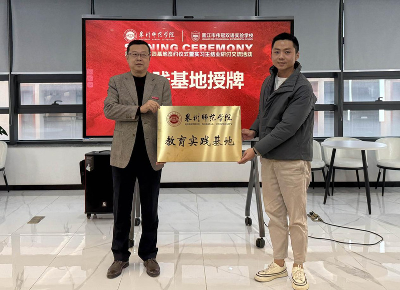 在随后的授牌环节中,王宝山书记为晋江市伟冠双语实验学校颁发了“教育实践基地”牌匾,蔡永辉院长为实习生导师颁发了聘书,进一步加强了双方在教育实践方面的合作。