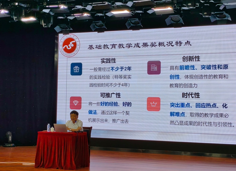 首先,魏献策校长从基础教育教学成果奖、成果概要、研究过程与方法、成效与推广四个方面开始讲起,他指出基础教育成果奖概况具有实践性、创新性、可推广性、时代性的特点。随后,魏献策校长对其问题导向与政策进行了充分解读,2014年教育部发布《关于全面深化课程改革落实立德树人根本任务的意见》“积极推进现代信息技术在教学中的科学应用,提高学生在信息技术环境中的学习能力。2017年教育部颁布的《普通高中历史课程标准》指出:“充分利用历史音像资料,有利于培养学生学习历史的兴趣和历史学习能力。”表明了影像史学与中学历史教学融合的必要性与重要性。其次,魏献策校长详细阐述了影像史学概念及研究成果,介绍了其学校的三个创新点,分别是:创建了全国第一个中学历史影像资料库;创设影像史学融入以学习为中心课堂的校本模式;开创影像史学优化中学历史教学的教研模式;紧接着,魏献策校长展示了学生制作的影像史学作业视频的成果,同学们全神贯注地聆听此次分享。
