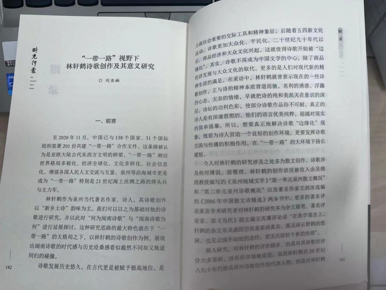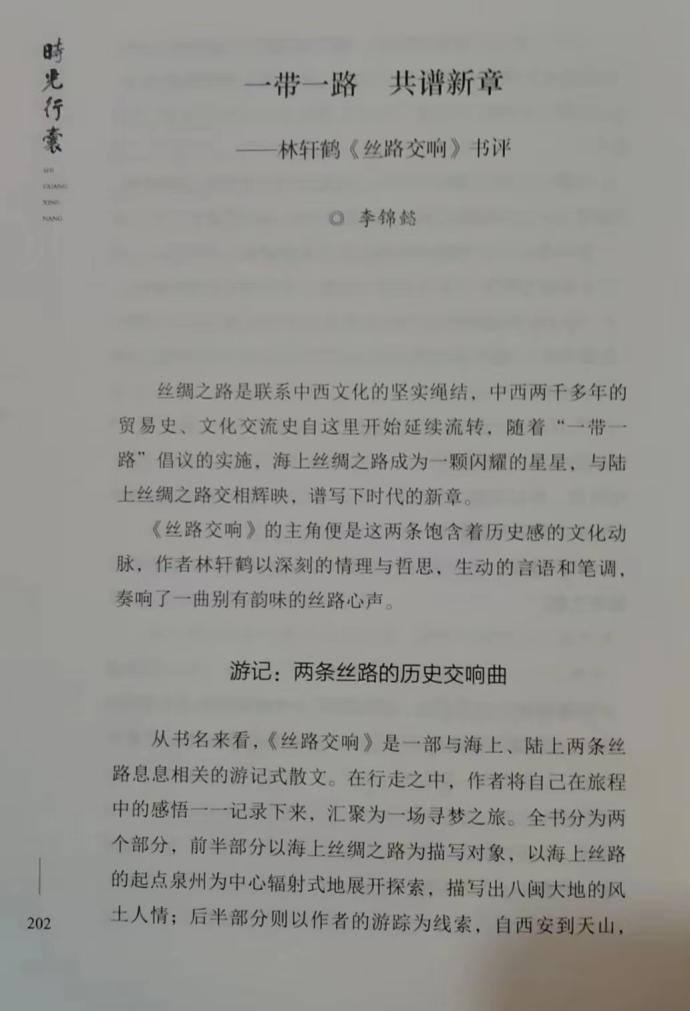 近日,泉州市作协副主席、《泉州晚报》首席评论员林轩鹤所著的“福建第一部日记体诗集”《时光行囊》一书于上海文艺出版社正式出版。这本书收录文传学院中文系汉语言文学专业毕业学生刘亚楠的诗评《“一带一路”视野下林轩鹤诗歌创作及其意义研究》、李锦懿的书评《一带一路共谱新章——林轩鹤〈丝路交响〉书评》。