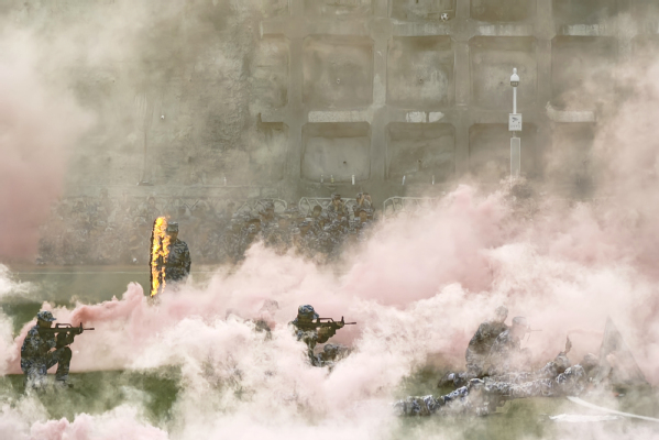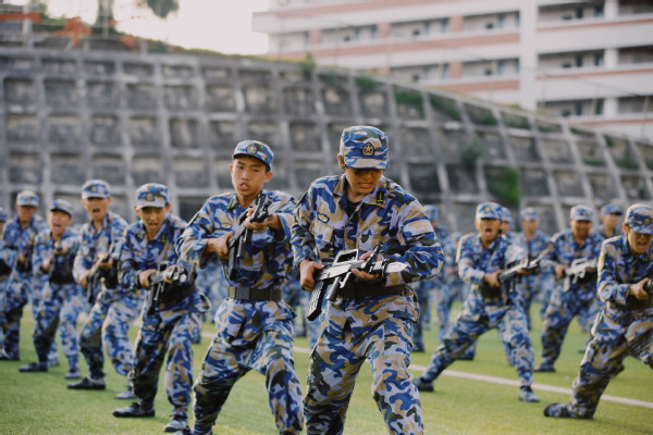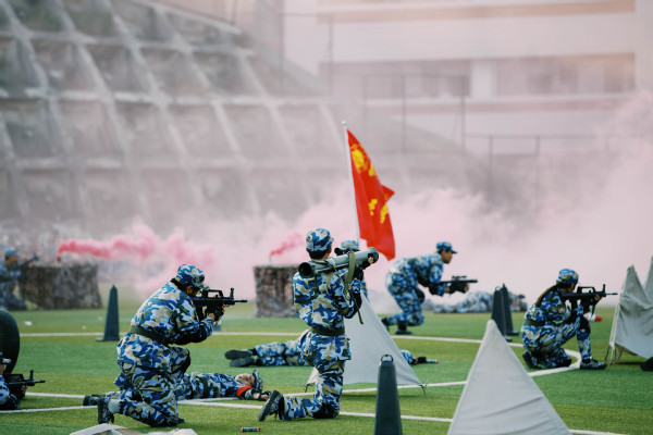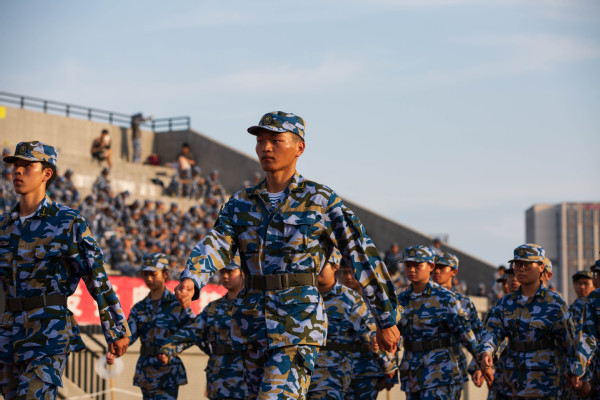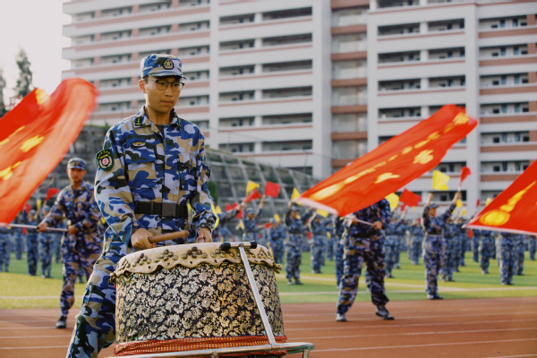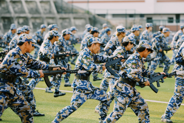 伴随雄壮的国歌声,军训会操拉开序幕。各方队依次列队,脚踢正步,有序入场。匕首操、军体拳、棍术、旗语操、刺杀操、战术方阵的学子们依次展开军事科目汇演。