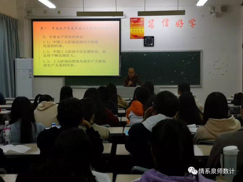 陈院长以“中国共产党的性质”展开了本次课程,他表示中国共产党的性质是“两个先锋队”、“一个领导核心”以及“三个代表”,并强调了中国共产党的最高理想和最终目标为实现共产主义。在讲授过程中,课堂气氛严肃而不失活跃,陈院长悉心讲解,同学们认真聆听,仔细做笔记。