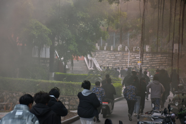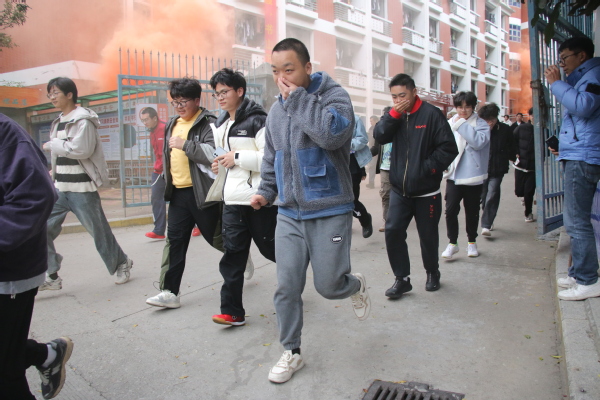 此次演练模拟了宿舍楼突发火灾的场景,随着模拟烟雾的释放和消防警报的响起,各宿舍楼学生在志愿者和引导老师的指挥下,迅速进入应急状态,严格按照消防逃生要求,用湿毛巾或衣物捂住口鼻,弯腰低姿,沿着预定的疏散路线快速、有序地向操场安全区域撤离。全体学生安全抵达操场后,各班负责人迅速清点人数,并及时向现场指挥汇报疏散情况。