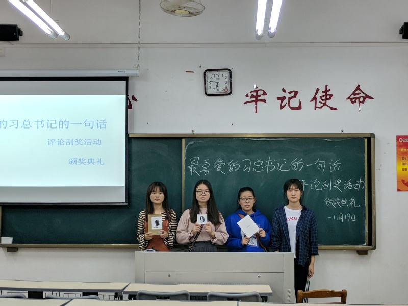 为促进我院大学生全面深入系统地学习和掌握习近平新时代中国特色社会主义思想,在学工办老师的指导以及院易班的协助下,我院于 2018年11月 11日——11月19日期间举办了“我最喜欢习主席的一句话”主题宣传教育活动。此次活动包含视频采访和评论刮奖两部分。在刮奖活动中,康婉华同学获得一等奖,瞿朝美获得二等奖,陈梓萱同学获得三等奖。