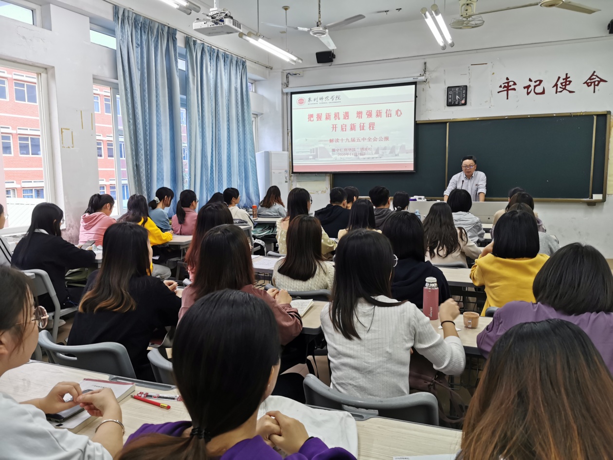 胡凌松重点对党的十九届五中全会召开的时代背景、会议概况和重大意义,从“决胜全面建成小康社会取得的决定性成就”“我国发展环境面临的深刻复杂变化”“到二〇三五年要实现的远景目标”“‘十四五’时期经济社会发展的主要目标”和“实现奋斗目标的具体举措”等方面,对《中共中央关于制定国民经济和社会发展第十四个五年规划和二〇三五年远景目标的建议》有关教育方面内容进行解读,和大家分享了学习党的十九届五中全会精神的体会。