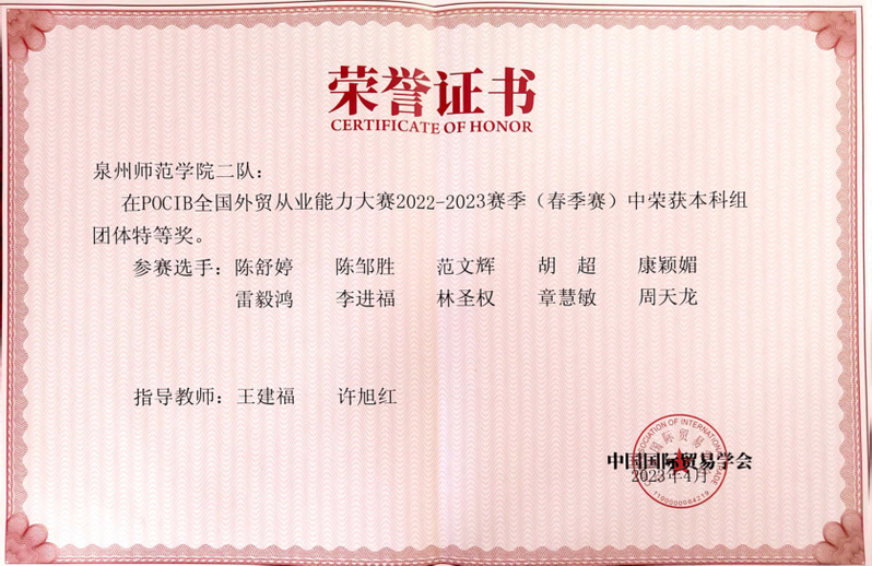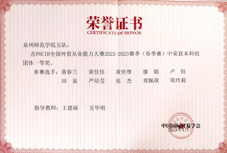 日前,POCIB全国外贸从业能力大赛2022-2023赛季(春季赛)成绩揭晓。在王建福、许旭红、黄身发、吴华明等老师的认真指导下,由陈守仁商学院陈舒婷、陈邹胜、范文辉、胡超、康颖媚、雷毅鸿、李进福、林圣权、章慧敏、周天龙同学组成的英国威廉希尔公司官网二队荣获本科组团体特等奖,由陈丹妮、黄春兰、蔡煊瑜等同学组成的英国威廉希尔公司官网四队、五队、六队,荣获本科组团体一等奖,英国威廉希尔公司官网一队、二队荣获本组团体二等奖。黄佳佳、黄世尊同学荣获个人一等奖,另有8位同学获个人二等奖,35位同学获个人三等奖。范文辉、黄佳佳、方媛、郭青、许甜甜、蔡煊瑜等六位同学同时获得《国际贸易从业技能综合实训合格证书》,王建福、许旭红、黄身发、吴华明等老师分别获得指导教师特等奖、一等奖。这是陈守仁商学院参加该赛事以来取得的历史最好成绩。