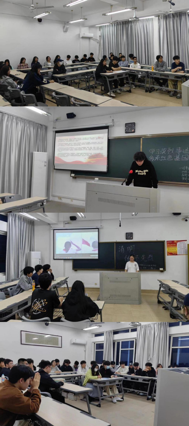 2023级国际经济与贸易二班团支部通过课件展示、名言朗读、视频播放等多种方式,带领同学们学习先烈的事迹,激发同学们对英雄的崇敬之情和对祖国的热爱之情;2023级电子商务专业团支部通过课件展示介绍英烈精神,讲述英雄事例,让同学们在缅怀先烈中叩问初心使命,赓续红色血脉;2023级市场营销专业团支部通过诗歌朗诵,进一步学习革命先烈精神,传递红色信仰力量。