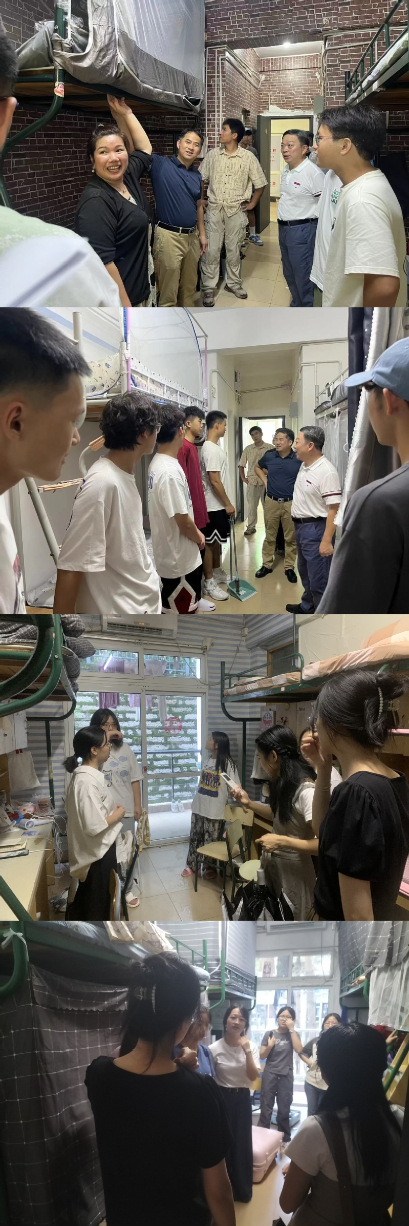 每到一个宿舍,学院领导老师都与同学们亲切交谈,详细询问了学生对新环境的适应情况,了解他们报到后的感受,叮嘱同学们要互相关心相互帮助,和睦相处。鼓励新生们要尽快适应大学生活,树立明确的学习目标,合理规划自己的大学生活,积极参与文体活动,不断提高个人的综合素养。同时,学院领导老师嘱咐同学们要树立安全意识,注意宿舍内的用电安全,希望同学们安全、充实的度过四年大学生活。