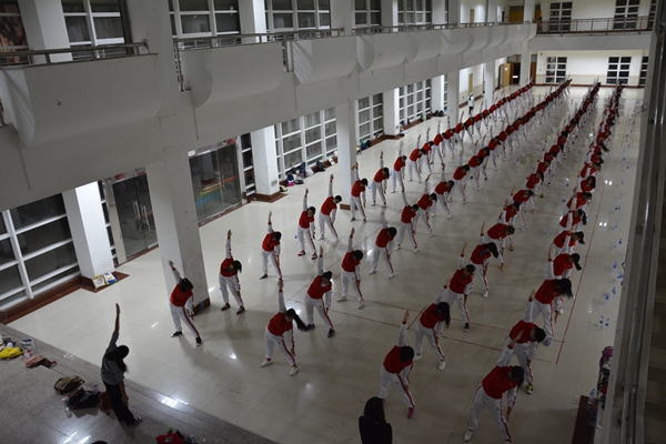 本报讯(记者:何晓敏)11月1日,在负责人的带领下,代表我院参加广播体操比赛的同学们在荣茂楼进行训练。先主要采用分解动作练习,在跟上节拍把每一个动作串联起来,最后合上音乐练习整套广播体操。同学们的动作整齐划一,刚劲有力。