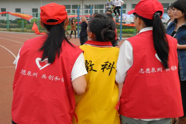 志愿者们在校运会期间扮演者重要的角色,每天清晨赶到操场上认真地布置比赛场地,落实各项比赛所需要的服务,每个环节都做得一丝不苟。在志愿者的大本营里,他们特地制作了运动会秩序册海报,里面详细的标明了比赛的时间和地点,为那些参加比赛和观看比赛的同学提供便利。他们带着美丽的笑容,坚守在志愿者大本营的岗位上,耐心地为大家解答不同的问题,并免费为运动员和工作人员提供茶水和休息的场所。大本营外的志愿者则顶着烈日穿梭在赛道上,他们除了维护比赛起点、终点和中途的秩序外,还帮助裁判员和老师让赛程顺利进行。傍晚,他们不辞辛劳的整理运动场上的东西,维护赛场的清洁后,才结束了一整天忙碌的服务工作。