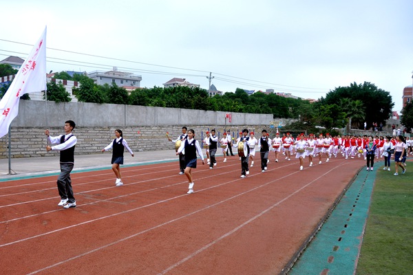 操场上气氛热烈,热闹非凡。一开始是各个学院方阵入场。走在最前面的是我校的国旗会,挺拔的身姿,矫健的步伐,无不让人赞叹不已。且较之以往不同之处,今年方阵队里出现了女生,英姿飒爽,颇有巾帼不让须眉之势。我院是作为第九个方阵出场,伴随着震耳的锣鼓声以及嘹亮的口号声“教科教科,一路高歌.....”同学们迈着有力的步伐缓缓进场,每个人的脸上都洋溢着饱满的笑容。在经过靠近篮球架一侧的跑道时,还别出心裁地用太阳花摆出“JK”造型。在整个运动员入场过程中,我校各个学院的方阵都向我们展示了本学院的风采,如美术与设计学院向我们展示了他们的作品,体育学院展示了一段精彩的武术表演等等,整个操场都被一股青春的气息紧紧包围。