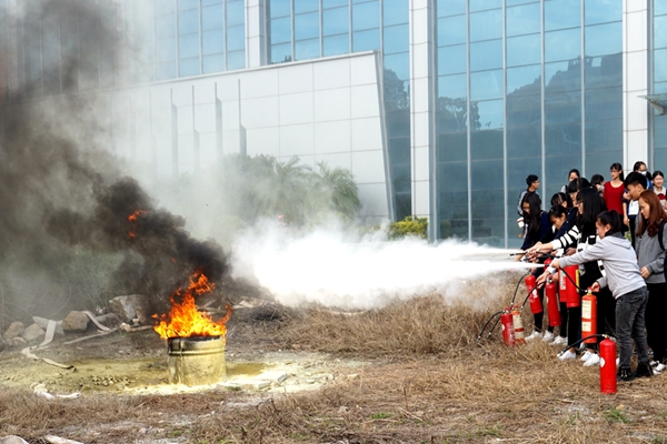 学生在使用灭火器灭火 (林咏茜 摄)