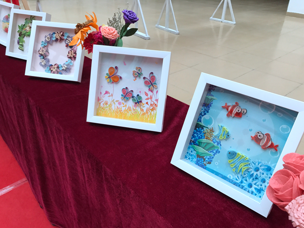 衍纸又称卷纸,因为制作的基础材料是卷曲的纸带而得名。它是将雕塑和绘画技艺融合在一起后转化为纸的艺术。本次的展品也各具特色,引人注目。玫瑰花、向日葵、月季花以及长在嫩藤上的花朵,都被制作的栩栩如生。房屋、帆船、蛋糕让前来欣赏的师生赞叹不已。三幅惠安女更是让人眼前一亮,从发髻到头上的花饰都制作的细致无比。展品凝聚着手工者的耐心与智慧。