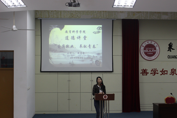 本报讯 (记者 李 静)4月12日,教育科学学院在中山报告厅三楼开展“爱岗敬业,奉献青春”道德讲堂活动。邀请泉州市第二届最美教师、丰泽区首届学雷锋优秀志愿项目奖获得者周月芬作为主讲人。
