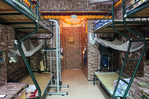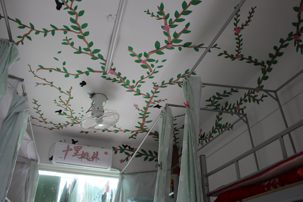 评委们参观了每一间宿舍,C区5栋304宿舍,以囚绿为名,绿色的空间,点缀着花、鸟、蝶与蜻蜓,充满生命活力的小世界让人眼前一亮。宿舍成员将废弃的衣物变废为宝,成为宿舍里一道独特的风景线。B区3栋504以桃花为主题,屋内的两棵桃树枝繁叶茂,分别象征了成员间的亲情与友情,“桃之夭夭,灼灼其华”是她们对自己宿舍的诠释。值得一提的是,B区1栋101是一间男生宿舍,宿舍内格外干净整洁,文化氛围浓厚。宿舍以棕色暗色调为主,配上颜色艳丽的藏族装饰物,如挂在阳台两侧写有藏文吉祥如意的字画,床上、门上装扮的彩带,对比鲜明而又不失趣味,汉藏文化完美融合,更体现出了同学间的友谊与亲情。
