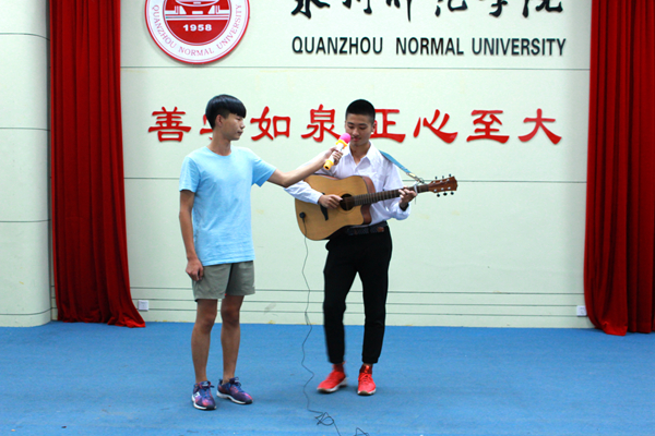 覃泽宜在表演吉他弹唱《真的爱你》 (朱 梅 摄)
