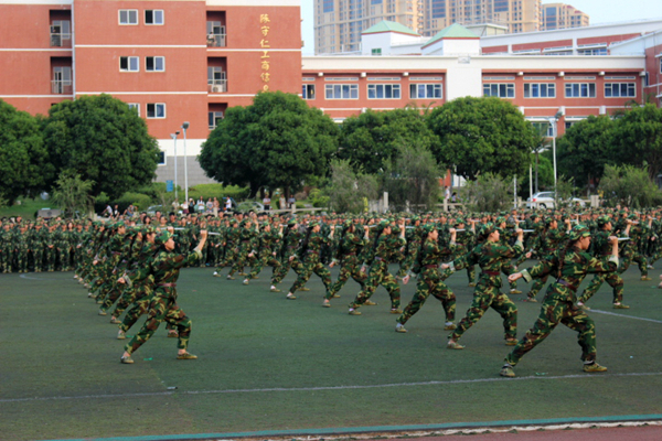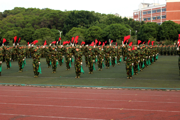 下午六点,国歌响起,军训汇报表演正式拉开帷幕。首先主持老师对学生军训进行总结,并为同学们对如何度过接下来的大学生活提出宝贵的建议。之后在一阵熟悉又庄严的音乐中,各学院方阵同学迈着整齐的步伐向主席台走来。他们目光坚毅、动作整齐划一、姿态气宇轩扬,口号豪迈响亮,经过了八天的磨练,他们更加意气风发,用行动诠释年轻的骄傲。激情四射的格斗表演、刚劲有力的匕首操、行云流水的旗语表演,现场气氛十分活跃.