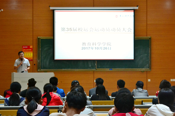 本报讯 (记者 李 静 实习记者 尹枭阳)10月26日,教育科学学院在特教大楼一楼107教室召开学校第35届校运会运动员动员大会。教育科学学院团委老师张甲玉、自律会体育部成员以及教育科学学院全体运动员参加了此次大会。