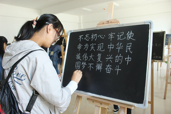 我院学生正在书写粉笔字(朱芸婧 摄)