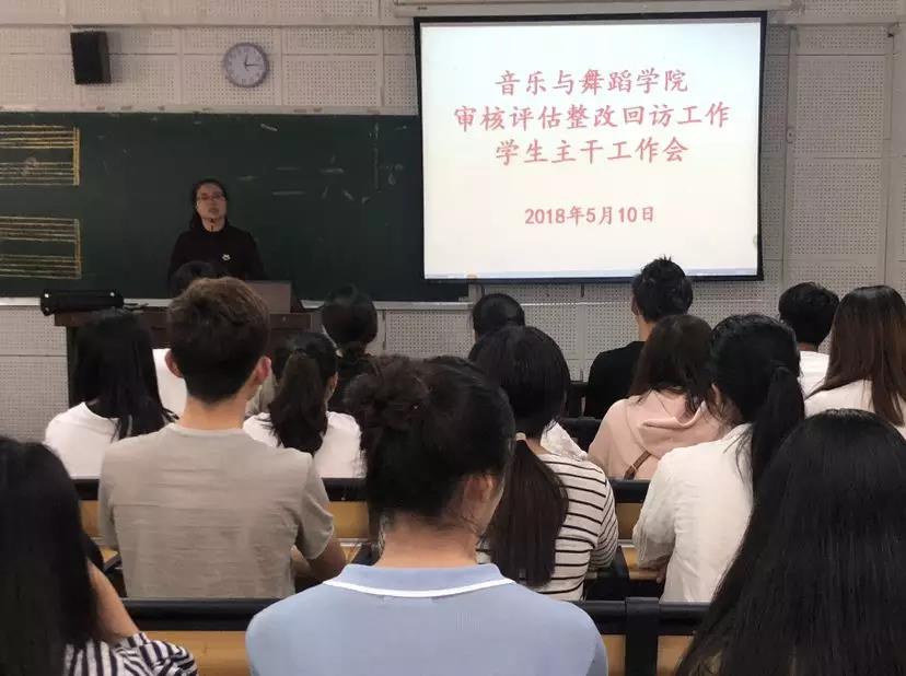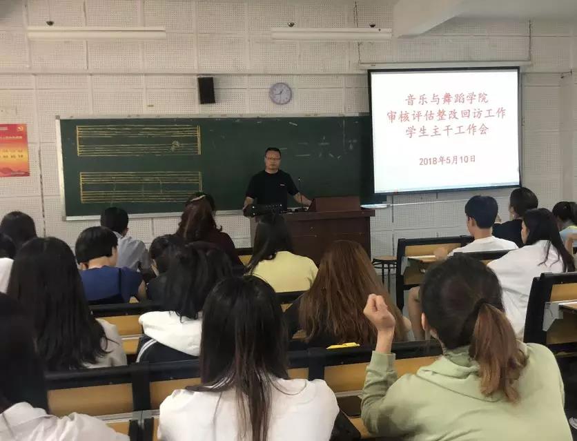 2018510日中午12点,音乐与舞蹈学院在E102召开“审核评估整改回访工作”学生主干工作会,会议由学工办副主任刘晓莹老师主持,学院党委蒋双霖书记、学工办辅导员老师及全体学生会、班级主干参加此次会议。