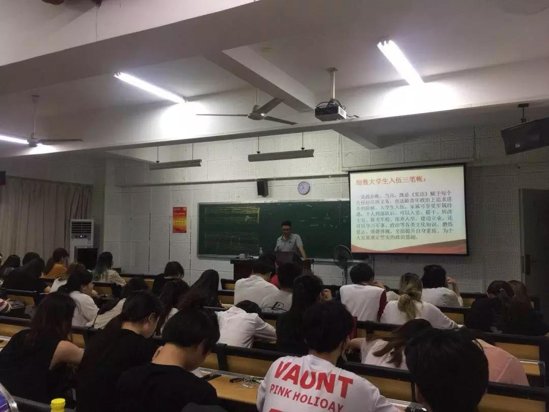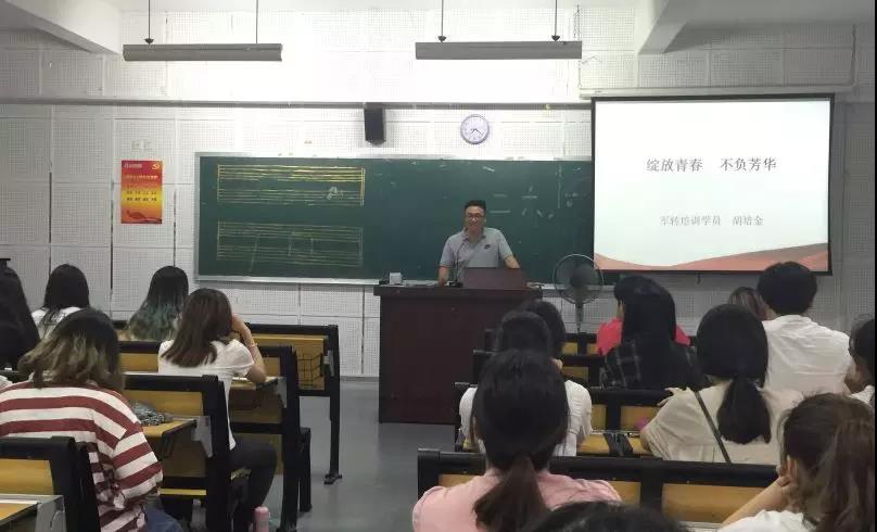 5月17日晚7点,音乐与舞蹈学院学工办在艺术大楼E101开展2018年大学生征兵入伍宣传主题教育活动,本次活动由军转干部胡培金带来主题讲座《绽放青春 不负芳华》,来自音舞学院各班的学生代表和有入伍意向的学生参加了本次活动。
