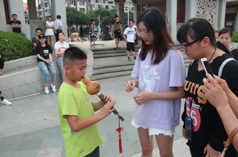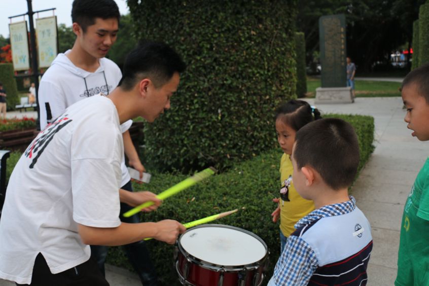 负责公益教学的志愿者们则分散在公园的各个景点或人流集中的地点开起了音乐公益课堂,教小朋友们弹奏西洋或民族乐器、学习南音乐器乐曲、学唱儿童歌谣、学习基本的乐理知识,带领孩子们一起感受音乐的非凡魅力。