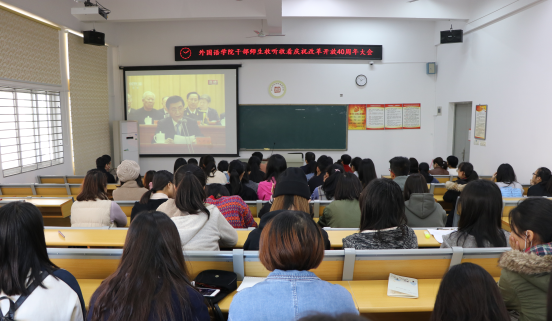 2018年12月18日上午十点,外国语学院党委结合工作实际,组织学院干部师生在外文楼112室收听收看中央庆祝改革开放40周年大会同步直播。