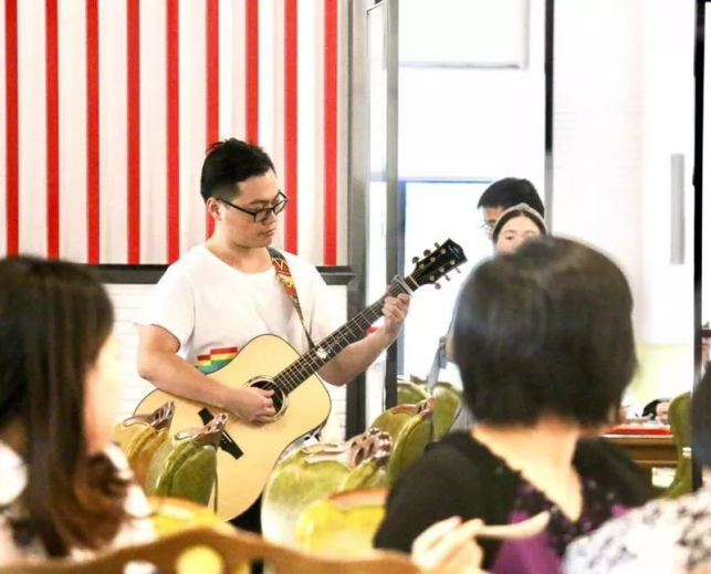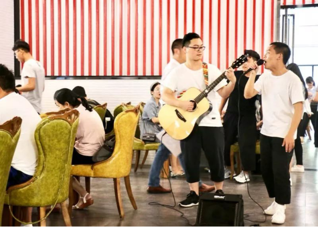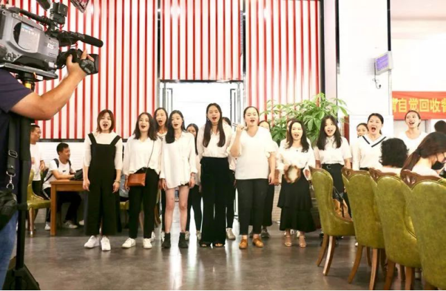 歌唱献礼的温馨延续到了午间食堂,音舞学院的学子们在特教大楼教职工食堂给老师们送上惊喜又精彩的快闪表演!当老师们在用餐时,50几名音舞学生出现在食堂,他们拿着手铃、吉他齐声唱着《那些花儿》、《稻香》、《蓝蓝的夜蓝蓝的梦》三首歌曲,歌声宛转悠扬,传达出他们对老师的祝福和感谢。