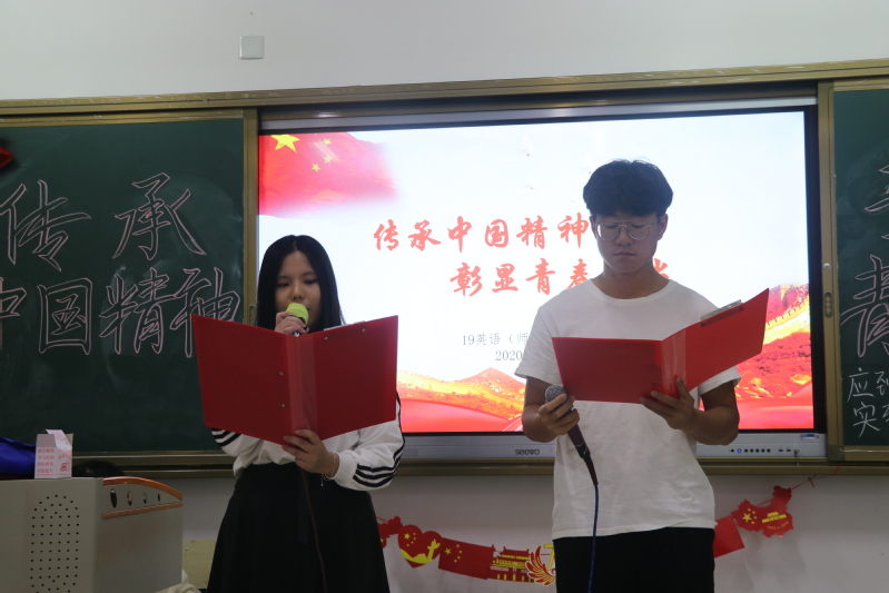 为引导当代大学生深入学习贯彻习近平新时代中国特色社会主义思想与传承、发扬以爱国主义为核心的民族精神和以改革创新为核心的时代精神,9月27日晚8时许,我院2019级商务英语1班、2019级英语(师范类)2班及2019级英语(非师类)2班分别于外文楼309、308、310教室举办以“传承中国精神,彰显时代担当”主题的班团日活动。