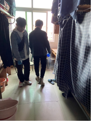 志愿者们佩戴好口罩、手套,进入宿舍后开窗通风,拿着消毒工具依次在宿舍门、洗漱台、地面、卫生间等地方喷洒消毒。