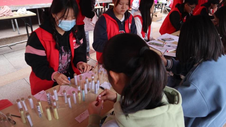 许愿瓶寄语环节中,同学们写下对艾滋病的理解或认识,并取走一个其他同学所写的,同意被分享的许愿瓶。