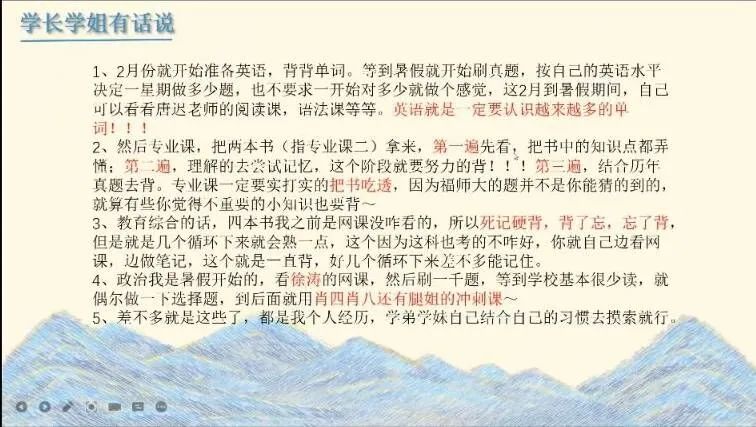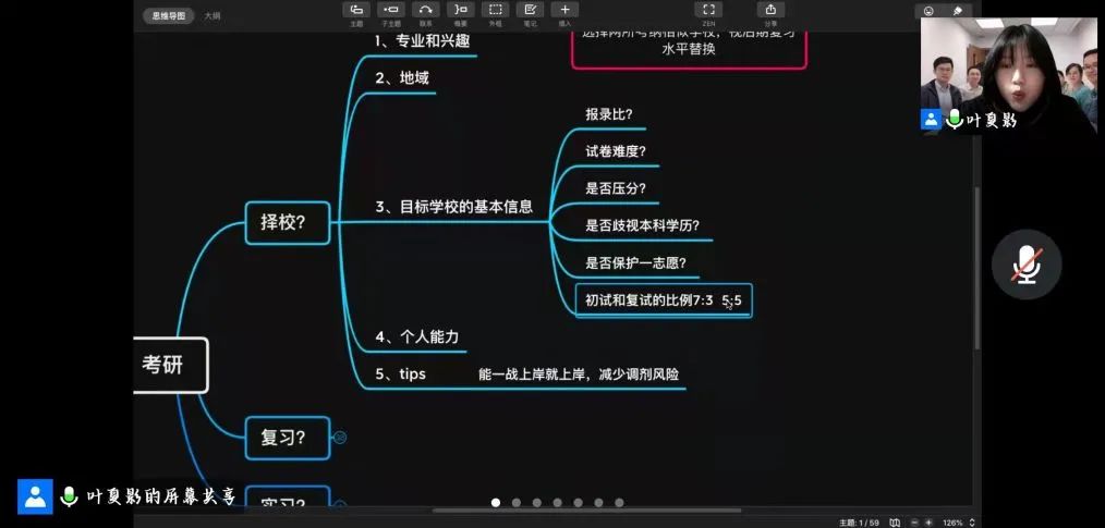 其中,文学与传播学院的主讲人叶夏影通过思维导图的形式分择校、复习和实习三个模块进行讲述;化工与材料学院2018级化工与制药类专业的王进翔为正在备考的学弟学妹们推荐了化工、政治、英语、数学的相关学习书籍,并附上了相关链接;