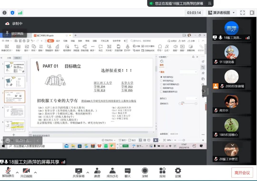 资源与环境科学学院的上岸选手们分享了他们在考研过程中的心路历程,为同学们在考研过程中如何进行情绪管理提供了强有力的参考;纺织与服装学院2018级纺织工程专业的方淑娟以问答的方式,详细解答了同学们有关考研的问题和疑惑,并推荐了高效的学习软件和优秀的讲课教师,同时以自身成绩与经历,鼓励同学们增强信心,积极备考。