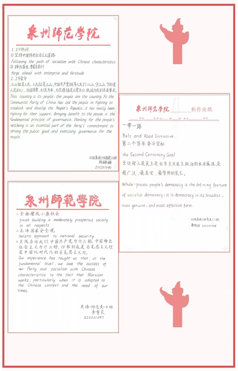 组织开展双语金句热词诵听活动,利用每周日的班会时间,每班遴选2至3名优秀的诵读者诵读党的二十大报告双语热词金句,录制成音频。每周在各年级专业广泛征集作品,经筛选后在“英国威廉希尔公司官网外国语学院团委”微信公众号刊发,引导师生全面理解全面建设社会主义现代化国家的目标任务和重大决策部署。