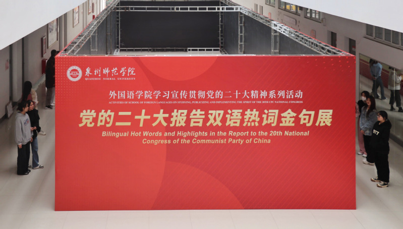举办党的二十大双语热词金句展,选取了《中国日报双语新闻》刊发的45个热词、55条金句,采用中文、英文双语的形式,以双语热词和金句这个最为精准有效的切入点,引导师生了解掌握党和国家事业取得历史性成就、发生历史性变革,深刻认识中国共产党为什么能、马克思主义为什么行、中国特色社会主义为什么好,激励师生以昂扬姿态满怀信心投身全面建设社会主义现代化国家新征程。
